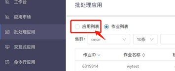 (1)点击侧边导航栏的“批处理应用”进入作业列表页面,选择“应用列 表”;