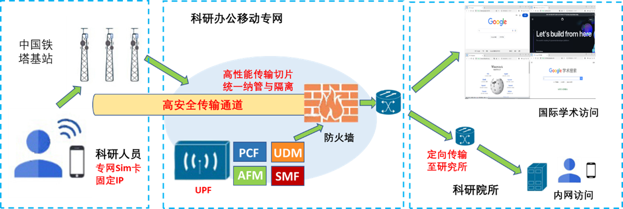 中国科技网科研办公移动专网依托高性能传输切片技术对科研业务移动流量进行统一的纳管与隔离,实现终端所有数据流量通过基站直通穿透至我院核心网网内,再根据终端访问目的地址通过专线分流至研究所或访问学术资源。终端固定一对一绑定科技网公网IP地址全程不变,可随身使用科技网IP办公,是外部数据回所的专用安全通道。可通过安装“科技专线”学术浏览器安全便捷的访问谷歌学术、GitHub等国际学术资源,助力高效开展科学研究。同时支持院内6位集团短号间不限量通话,与日常11位手机号码相隔离,有效分离生活电话与工作电话。